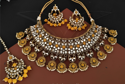 Mint Green Kundan Choker Necklace & Earring Set With Maang Tika